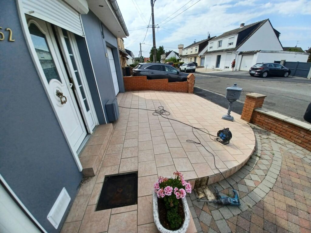 Après une dépose soignée et une préparation précise du support, nous avons installé un carrelage grand format, parfaitement nivelé et adapté aux contraintes extérieures.